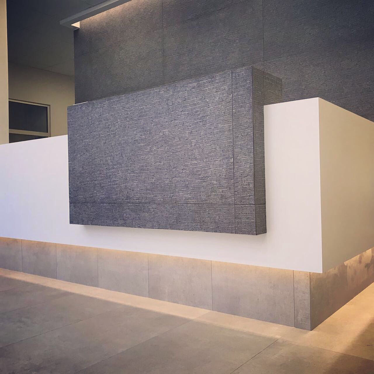 Siempre presente los materiales de piedra, madera y latón, perfecto juego para materializar la geometría y envolvente que se ha decidido experimentar.